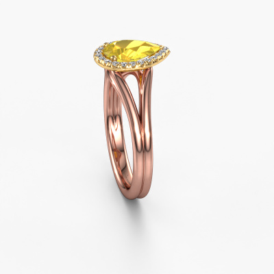 This 14 Carat rose gold ring is called Verla pear 1 and is set with 8x6 mm yellow sapphire. This exclusive rose gold halo engagement ring is a true work of art! The ornaments are crafted with a lot of patience and great passion. In order to create this ring with great precision, this craft requires a keen eye and skilful hand. A challenge which ignites a fire in our expert goldsmith. The exquisite yellow sapphire are set in a special way so they stand out even more. This gives the ring an even more glamorous appearance. The graceful engagement ring is actually unique on its own because of the gemstones which we carefully select especially for this ring. On top of that you select the precious metals which will be used to create a unique ring for the most extraordinary woman in your life! This jewel is made to shine bright around your finger. Each jewel is hand made with love by our goldsmiths.By using a combination of the latest modern techniques, combined with ancient crafting, we can make all our engagement rings in our own studio. Each jewel is made to order. This is advantageous because we can offer you a price you won't find anywhere else.Have you found a specific engagement ring somewhere which you would like to give to your loved one? Please feel free to express your wishes to our jewel designers because we would be honoured to turn your design into a luxury engagement ring. You can follow the development of your ring design because we use 3D drawings. This gives you a realistic preview of how your design will look. You can also preorder a dummy. A dummy is a plastic ring, which can be shaped according your ring design. You can try it on and check if its width and size are suitable for you. We will gladly send you a non-binding offer, based on a fair price/ quality ratio. It will amaze you, considering the quality of the ring and gemstones.To make it easier for you, we offer a 30 day return policy. Check our terms and conditions.