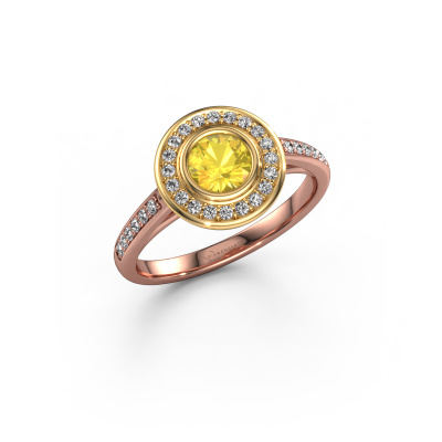 The ring shown above is called the Noud 2 RND. We call this type of ring a halo ring because it has one centre gemstone and a band that is also pave set with gemstones. The 14 Carat rose gold engagement ring is set with a round 5 mm yellow sapphire centre stone and the band is pave set with diamonds. What makes this luxury rose gold halo ring special are the smaller sized stones embracing the centre stone. This gorgeous engagement ring is called a halo ring because the smaller gemstones give the centre stone a halo of surrounding light. In order for the smaller stones to enhance the centre stone, they have to be placed so there is no interference of light. And that's when our expert goldsmiths come in. Each individual stone is carefully set in the ring by hand. During manufacturing, light fall is constantly monitored to make sure the special halo is still visible. In the end you get a unique engagement ring, with a yellow sapphire of your choosing at its centre. You can imagine the effect of a ring of such significance when you give it to her on her special day to shine. By using a combination of the latest modern techniques, combined with ancient crafting, we can make all our engagement rings in our own studio. Each jewel is made to order. This is advantageous because we can offer you a price you won't find anywhere else.Have you found a specific engagement ring somewhere which you would like to give to your loved one? Please feel free to express your wishes to our jewel designers because we would be honoured to turn your design into a luxury engagement ring. You can follow the development of your ring design because we use 3D drawings. This gives you a realistic preview of how your design will look. You can also preorder a dummy. A dummy is a plastic ring, which can be shaped according your ring design. You can try it on and check if its width and size are suitable for you. We will gladly send you a non-binding offer, based on a fair price/ quality ratio. It will amaze you, considering the quality of the ring and gemstones.To make it easier for you, we offer a 30 day return policy. Check our terms and conditions.