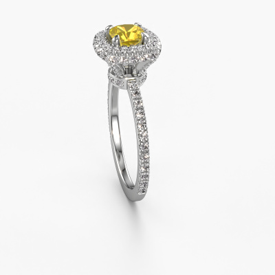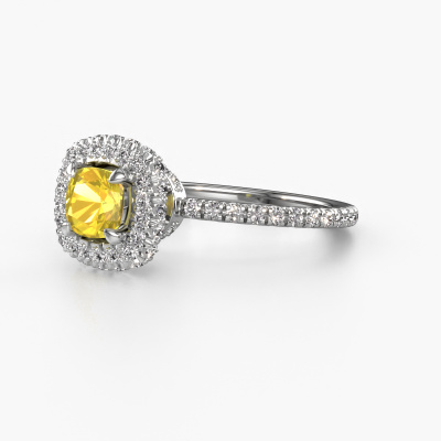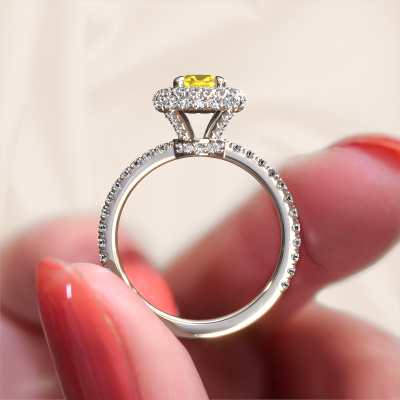 The ring shown above is called the Talitha CUS. We call this type of ring a halo ring because it has one centre gemstone and a band that is also pave set with gemstones. The 14 Carat white gold engagement ring is set with a cushion 5 mm yellow sapphire centre stone and the band is pave set with diamonds. What makes this traditional white gold halo ring special are the smaller sized stones embracing the centre stone. This gorgeous engagement ring is called a halo ring because the smaller gemstones give the centre stone a halo of surrounding light. In order for the smaller stones to enhance the centre stone, they have to be placed so there is no interference of light. And that's when our expert goldsmiths come in. Each individual stone is carefully set in the ring by hand. During manufacturing, light fall is constantly monitored to make sure the special halo is still visible. In the end you get a unique engagement ring, with a yellow sapphire of your choosing at its centre. You can imagine the effect of a ring of such significance when you give it to her on her special day to shine. Because we design and deliver our own rings, we can offer you a engagement ring at a price you won't find anywhere else. A ring is made to order, which helps prevent excess supplies, so we can make you a great price offer. We understand it feels risky, buying your engagement ring online, but we will gladly assist in the designing process, taking your budget into consideration.Our designers and goldsmiths work together each day, creating new jewels. Perhaps you have found a nice traditional engagement ring somewhere, which can be used to customize your unique ring. Please feel free to contact us. We will make you an offer, based on a fair price/ quality ratio, which will amaze you.To make it easier for you, we offer a 30 day return policy. Check our terms and conditions.