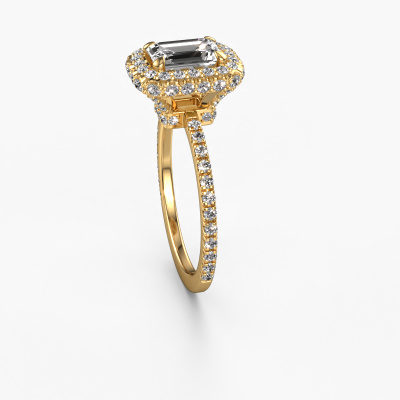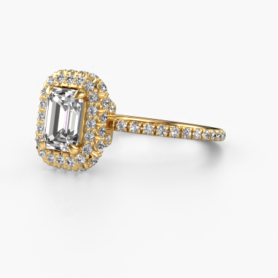 The ring shown above is called the Talitha EME. We call this type of ring a halo ring because it has one centre gemstone and a band that is also pave set with gemstones. The 14 Carat gold engagement ring is set with a emerald cut 7x5 mm zirconia centre stone and the band is pave set with lab-grown diamonds. What makes this luxury gold halo ring special are the smaller sized stones embracing the centre stone. This gorgeous engagement ring is called a halo ring because the smaller gemstones give the centre stone a halo of surrounding light. In order for the smaller stones to enhance the centre stone, they have to be placed so there is no interference of light. And that's when our expert goldsmiths come in. Each individual stone is carefully set in the ring by hand. During manufacturing, light fall is constantly monitored to make sure the special halo is still visible. In the end you get a unique engagement ring, with a zirconia of your choosing at its centre. You can imagine the effect of a ring of such significance when you give it to her on her special day to shine. By using our modern techniques, we can design and customize the finest quality jewels with the utmost care for you. Our engagement rings are always priced 30 percent lower than other jewellers. We make engagement rings to order so we don't have to maintain a large stock. If you have a certain budget, we are more than happy to advice you accordingly.Our team adds new designs to our online collection daily. Our designers and goldsmiths work together in creating the best design. We strive to offer a diverse collection of jewels. Perhaps you have a specific jewel design in mind. One you came across somewhere. Please contact us for a free consultation. We will make you an offer, based on a fair price/ quality ratio, that will baffle you.To make it easier for you, we offer a 30 day return policy. Check our terms and conditions.