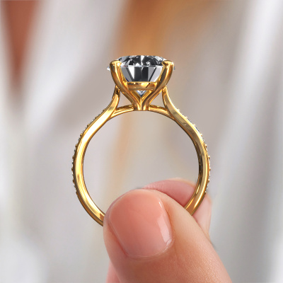 The ring shown above is called the Mignon OVL 2, we call this a solitaire ring because it contains a single gemstone. The engagement ring is made in 14 Carat gold and has a oval lab grown diamond of 5.05 crt. The cool thing about our configurator is that you can compile your own piece of jewellery, into a completely personalized one. This solitaire ring is crafted in the precious metals gold with gold, but of course you are free to pick your own colours. Each piece of jewellery is made with passion and love by one of our master goldsmiths.The solitaire ring is a special type of engagement ring. Its open prong setting allows light to strike the gemstone from various angles. This chic engagement ring is a stunning eye-catcher because of the high positioning of the gemstone. In order for you to commemorate your proposal with a unique ring, we carefully adorn this solitaire ring by hand. The love of your life deserves nothing but the best. After receiving your order, our goldsmiths will passionately start the creative process of making your engagement ring in our own studio. Because we don't have a big stockpile, these costs will not be passed on to you. Our pricing is proof of that! We offer top quality jewels at lowest price, guaranteed.Our team adds new designs to our online collection daily. Our designers and goldsmiths work together in creating the best design. We strive to offer a diverse collection of jewels. Perhaps you have a specific jewel design in mind. One you came across somewhere. Please contact us for a free consultation. We will make you an offer, based on a fair price/ quality ratio, that will baffle you.To make it easier for you, we offer a 30 day return policy. Check our terms and conditions.