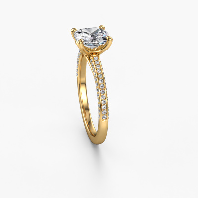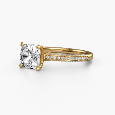 The ring shown above is called the Elenore cus. We call this type of ring a pavé solitaire ring because it has one centre gemstone and a band that is also pave set with gemstones. This engagement ring is made in 14 Carat gold set with a 2.00 crt cushion lab grown diamond, and pave set lab-grown diamonds at the sides. Each piece of jewellery is made by a team of passionate goldsmiths and jewel designers. This will make your crown jewel truly eye-catching.This contemporary gold pavé solitaire engagement ring has an exquisite cushion lab grown diamond centre stone. To further accentuate the centre stone, the band is set full with more lab-grown diamonds. Its open prong setting allows light to strike the lab grown diamond from various angles and this adds sparkle to your lab grown diamond ring. The photo shown above depicts the goldsmith's carefully handcrafted details of the ring. The high positioning of the centre stone is truly eye-catching. The perfect engagement ring for the crown jewel of your life!After receiving your order, our goldsmiths will start the creative process of making your Elenore cus engagement ring. We don't keep stock. This is advantageous because these costs will not be passed on to you. Therefore, we can offer jewellery at exceptionally low prices.Have you found a specific engagement ring somewhere which you would like to give to your loved one? Please feel free to express your wishes to our jewel designers because we would be honoured to turn your design into a contemporary engagement ring. You can follow the development of your ring design because we use 3D drawings. This gives you a realistic preview of how your design will look. You can also preorder a dummy. A dummy is a plastic ring, which can be shaped according your ring design. You can try it on and check if its width and size are suitable for you. We will gladly send you a non-binding offer, based on a fair price/ quality ratio. It will amaze you, considering the quality of the ring and gemstones.To make it easier for you, we offer a 30 day return policy. Check our terms and conditions.