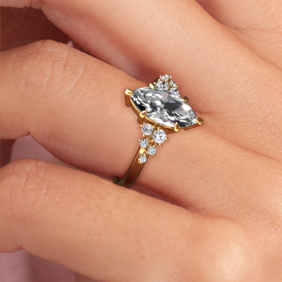 The ring shown above is called the Royce MRQ. We call this type of ring a pavé solitaire ring because it has one centre gemstone and a band that is also pave set with gemstones. This engagement ring is made in 14 Carat gold set with a 1.50 crt marquise lab grown diamond, and pave set lab-grown diamonds at the sides. Each piece of jewellery is made with passion and love by one of our master goldsmiths.This contemporary gold pavé solitaire engagement ring has an exquisite marquise lab grown diamond centre stone. To further accentuate the centre stone, the band is set full with more lab-grown diamonds. Its open prong setting allows light to strike the lab grown diamond from various angles and this adds sparkle to your lab grown diamond ring. The photo shown above depicts the goldsmith's carefully handcrafted details of the ring. The high positioning of the centre stone is truly eye-catching. The perfect engagement ring for the crown jewel of your life!By using a combination of the latest modern techniques, combined with ancient crafting, we can make all our engagement rings in our own studio. Each jewel is made to order. This is advantageous because we can offer you a price you won't find anywhere else.Our team adds new designs to our online collection daily. Our designers and goldsmiths work together in creating the best design. We strive to offer a diverse collection of jewels. Perhaps you have a specific jewel design in mind. One you came across somewhere. Please contact us for a free consultation. We will make you an offer, based on a fair price/ quality ratio, that will baffle you.To make it easier for you, we offer a 30 day return policy. Check our terms and conditions.