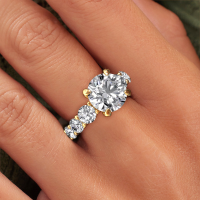 The ring shown above is called the Deja. We call this type of ring a pavé solitaire ring because it has one centre gemstone and a band that is also pave set with gemstones. This engagement ring is made in 14 Carat gold set with a 4.00 crt round lab grown diamond, and pave set lab-grown diamonds at the sides. Each piece of jewellery is made just for you by our master goldsmiths in our own studio.This exclusive gold pavé solitaire engagement ring has an exquisite round lab grown diamond centre stone. To further accentuate the centre stone, the band is set full with more lab-grown diamonds. Its open prong setting allows light to strike the lab grown diamond from various angles and this adds sparkle to your lab grown diamond ring. The photo shown above depicts the goldsmith's carefully handcrafted details of the ring. The high positioning of the centre stone is truly eye-catching. The perfect engagement ring for the crown jewel of your life!By using a combination of the latest modern techniques, combined with ancient crafting, we can make all our engagement rings in our own studio. Each jewel is made to order. This is advantageous because we can offer you a price you won't find anywhere else.Our team adds new designs to our online collection daily. Our designers and goldsmiths work together in creating the best design. We strive to offer a diverse collection of jewels. Perhaps you have a specific jewel design in mind. One you came across somewhere. Please contact us for a free consultation. We will make you an offer, based on a fair price/ quality ratio, that will baffle you.To make it easier for you, we offer a 30 day return policy. Check our terms and conditions.