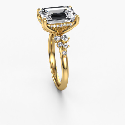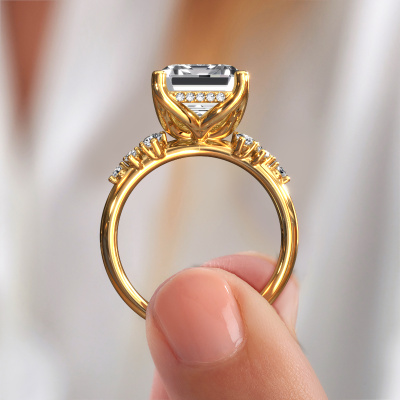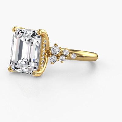 The ring shown above is called the Emma EME. We call this type of ring a pavé solitaire ring because it has one centre gemstone and a band that is also pave set with gemstones. This engagement ring is made in 14 Carat gold set with a 5.21 crt emerald cut lab grown diamond, and pave set lab-grown diamonds at the sides. Each piece of jewellery is made with passion and love by one of our master goldsmiths.This fantasy gold pavé solitaire engagement ring has an exquisite emerald cut lab grown diamond centre stone. To further accentuate the centre stone, the band is set full with more lab-grown diamonds. Its open prong setting allows light to strike the lab grown diamond from various angles and this adds sparkle to your lab grown diamond ring. The photo shown above depicts the goldsmith's carefully handcrafted details of the ring. The high positioning of the centre stone is truly eye-catching. The perfect engagement ring for the crown jewel of your life!After receiving your order, our goldsmiths will passionately start the creative process of making your engagement ring in our own studio. Because we don't have a big stockpile, these costs will not be passed on to you. Our pricing is proof of that! We offer top quality jewels at lowest price, guaranteed.Our team adds new designs to our online collection daily. Our designers and goldsmiths work together in creating the best design. We strive to offer a diverse collection of jewels. Perhaps you have a specific jewel design in mind. One you came across somewhere. Please contact us for a free consultation. We will make you an offer, based on a fair price/ quality ratio, that will baffle you.To make it easier for you, we offer a 30 day return policy. Check our terms and conditions.