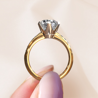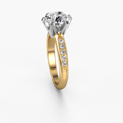 The ring shown above is called the Tiffy 2. We call this type of ring a pavé solitaire ring because it has one centre gemstone and a band that is also pave set with gemstones. This engagement ring is made in 14 Carat gold set with a 2.00 crt round lab grown diamond, and pave set diamonds at the sides. Each piece of jewellery is created to add sparkle to your finger, each jewel is lovingly made by hand by our goldsmiths.This traditional gold pavé solitaire engagement ring has an exquisite round lab grown diamond centre stone. To further accentuate the centre stone, the band is set full with more diamonds. Its open prong setting allows light to strike the lab grown diamond from various angles and this adds sparkle to your lab grown diamond ring. The photo shown above depicts the goldsmith's carefully handcrafted details of the ring. The high positioning of the centre stone is truly eye-catching. The perfect engagement ring for the crown jewel of your life!By using our modern techniques, we can design and customize the finest quality jewels with the utmost care for you. Our engagement rings are always priced 30 percent lower than other jewellers. We make engagement rings to order so we don't have to maintain a large stock. If you have a certain budget, we are more than happy to advice you accordingly.Our designers and goldsmiths work together each day, creating new jewels. Perhaps you have found a nice traditional engagement ring somewhere, which can be used to customize your unique ring. Please feel free to contact us. We will make you an offer, based on a fair price/ quality ratio, which will amaze you.To make it easier for you, we offer a 30 day return policy. Check our terms and conditions.