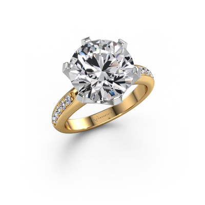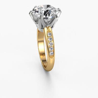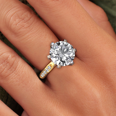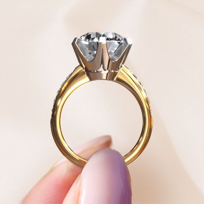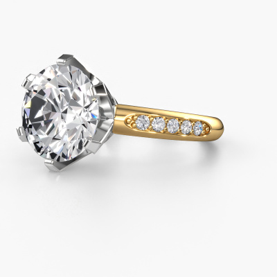 The ring shown above is called the Tiffy 2. We call this type of ring a pavé solitaire ring because it has one centre gemstone and a band that is also pave set with gemstones. This engagement ring is made in 14 Carat gold set with a 5.00 crt round lab grown diamond, and pave set diamonds at the sides. Each piece of jewellery is created to add sparkle to your finger, each jewel is lovingly made by hand by our goldsmiths.This traditional gold pavé solitaire engagement ring has an exquisite round lab grown diamond centre stone. To further accentuate the centre stone, the band is set full with more diamonds. Its open prong setting allows light to strike the lab grown diamond from various angles and this adds sparkle to your lab grown diamond ring. The photo shown above depicts the goldsmith's carefully handcrafted details of the ring. The high positioning of the centre stone is truly eye-catching. The perfect engagement ring for the crown jewel of your life!By using our modern techniques, we can design and customize the finest quality jewels with the utmost care for you. Our engagement rings are always priced 30 percent lower than other jewellers. We make engagement rings to order so we don't have to maintain a large stock. If you have a certain budget, we are more than happy to advice you accordingly.Our designers and goldsmiths work together each day, creating new jewels. Perhaps you have found a nice traditional engagement ring somewhere, which can be used to customize your unique ring. Please feel free to contact us. We will make you an offer, based on a fair price/ quality ratio, which will amaze you.To make it easier for you, we offer a 30 day return policy. Check our terms and conditions.