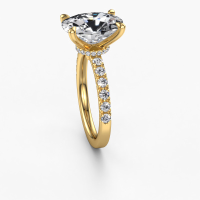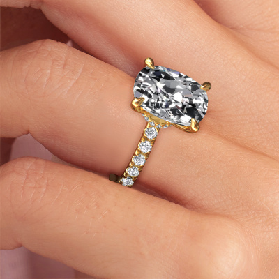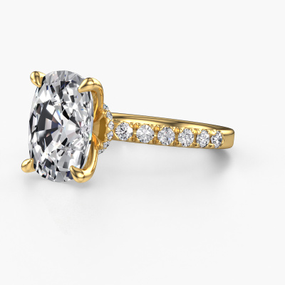 The ring shown above is called the Crystal CSH 4. We call this type of ring a pavé solitaire ring because it has one centre gemstone and a band that is also pave set with gemstones. The 14 Carat gold engagement ring is set with a cushion rectangle 5.00 crt lab grown diamond centre stone and the band is pave set with lab grown diamond gemstones. Each jewel is made with passion and love by one of our master goldsmiths.This chic gold pavé solitaire engagement ring has an exquisite cushion rectangle lab grown diamond centre stone. To further accentuate the centre stone, the band is fully set with more lab-grown diamonds. Its open prong setting allows light to strike the lab grown diamond from various angles and this adds sparkle to your lab grown diamond ring. The photo shown above depicts the goldsmith's carefully handcrafted details of the ring. The high positioning of the centre stone is truly eye-catching. The perfect engagement ring for the crown jewel of your life! By using a combination of the latest modern techniques, combined with ancient crafting, we can make all our engagement rings in our own studio. Each jewel is made to order. This is advantageous because we can offer you a price you won't find anywhere else.Our designers and goldsmiths work together each day, creating new jewels. Perhaps you have found a nice chic engagement ring somewhere, which can be used to customize your unique ring. Please feel free to contact us. We will make you an offer, based on a fair price/ quality ratio, which will amaze you.To make it easier for you, we offer a 30 day return policy. Check our terms and conditions.