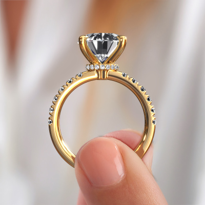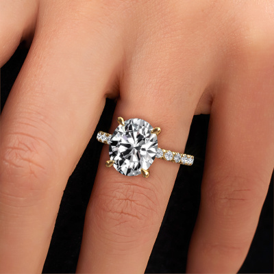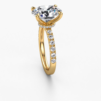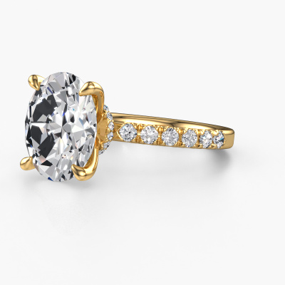 The ring shown above is called the Crystal OVL 4. We call this type of ring a pavé solitaire ring because it has one centre gemstone and a band that is also pave set with gemstones. The 14 Carat gold engagement ring is set with a oval 5.05 crt lab grown diamond centre stone and the band is pave set with diamond gemstones. Each jewel is made with passion and love by one of our master goldsmiths.This contemporary gold pavé solitaire engagement ring has an exquisite oval lab grown diamond centre stone. To further accentuate the centre stone, the band is fully set with more diamonds. Its open prong setting allows light to strike the lab grown diamond from various angles and this adds sparkle to your lab grown diamond ring. The photo shown above depicts the goldsmith's carefully handcrafted details of the ring. The high positioning of the centre stone is truly eye-catching. The perfect engagement ring for the crown jewel of your life! After receiving your order, our goldsmiths will passionately start the creative process of making your engagement ring in our own studio. Because we don't have a big stockpile, these costs will not be passed on to you. Our pricing is proof of that! We offer top quality jewels at lowest price, guaranteed.Our team adds new designs to our online collection daily. Our designers and goldsmiths work together in creating the best design. We strive to offer a diverse collection of jewels. Perhaps you have a specific jewel design in mind. One you came across somewhere. Please contact us for a free consultation. We will make you an offer, based on a fair price/ quality ratio, that will baffle you.To make it easier for you, we offer a 30 day return policy. Check our terms and conditions.