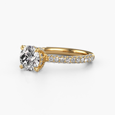 The ring shown above is called the Saskia rnd 2. We call this type of ring a pavé solitaire ring because it has one centre gemstone and a band that is also pave set with gemstones. The 14 Carat gold engagement ring is set with a round 1.30 crt lab grown diamond centre stone and the band is pave set with lab grown diamond gemstones. Each jewel is made by a team of passionate goldsmiths and jewel designers. This will make your crown jewel truly eye-catching.This exclusive gold pavé solitaire engagement ring has an exquisite round lab grown diamond centre stone. To further accentuate the centre stone, the band is fully set with more lab-grown diamonds. Its open prong setting allows light to strike the lab grown diamond from various angles and this adds sparkle to your lab grown diamond ring. The photo shown above depicts the goldsmith's carefully handcrafted details of the ring. The high positioning of the centre stone is truly eye-catching. The perfect engagement ring for the crown jewel of your life! After receiving your order, our goldsmiths will passionately start the creative process of making your engagement ring in our own studio. Because we don't have a big stockpile, these costs will not be passed on to you. Our pricing is proof of that! We offer top quality jewels at lowest price, guaranteed.Our team adds new designs to our online collection daily. Our designers and goldsmiths work together in creating the best design. We strive to offer a diverse collection of jewels. Perhaps you have a specific jewel design in mind. One you came across somewhere. Please contact us for a free consultation. We will make you an offer, based on a fair price/ quality ratio, that will baffle you.To make it easier for you, we offer a 30 day return policy. Check our terms and conditions.