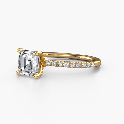 The ring shown above is called the Crystal ASSC 2. We call this type of ring a pavé solitaire ring because it has one centre gemstone and a band that is also pave set with gemstones. The 14 Carat gold engagement ring is set with a asscher 1.50 crt lab grown diamond centre stone and the band is pave set with diamond gemstones. Each jewel is made just for you, with attention to detail and design.This luxury gold pavé solitaire engagement ring has an exquisite asscher lab grown diamond centre stone. To further accentuate the centre stone, the band is fully set with more diamonds. Its open prong setting allows light to strike the lab grown diamond from various angles and this adds sparkle to your lab grown diamond ring. The photo shown above depicts the goldsmith's carefully handcrafted details of the ring. The high positioning of the centre stone is truly eye-catching. The perfect engagement ring for the crown jewel of your life! After receiving your order, our goldsmiths will passionately start the creative process of making your engagement ring in our own studio. Because we don't have a big stockpile, these costs will not be passed on to you. Our pricing is proof of that! We offer top quality jewels at lowest price, guaranteed.Our designers and goldsmiths work together each day, creating new jewels. Perhaps you have found a nice luxury engagement ring somewhere, which can be used to customize your unique ring. Please feel free to contact us. We will make you an offer, based on a fair price/ quality ratio, which will amaze you.To make it easier for you, we offer a 30 day return policy. Check our terms and conditions.