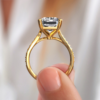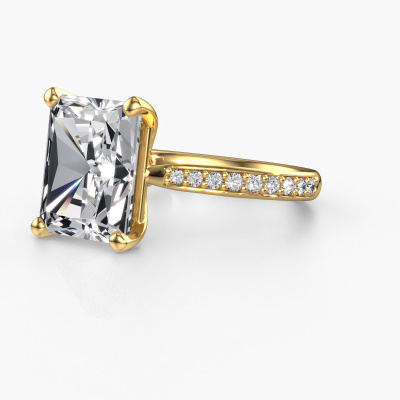 The ring shown above is called the Mignon RAD 2. We call this type of ring a pavé solitaire ring because it has one centre gemstone and a band that is also pave set with gemstones. The 14 Carat gold engagement ring is set with a radiant 5.05 crt lab grown diamond centre stone and the band is pave set with lab grown diamond gemstones. Each jewel is unique in every way! Simply customize to your liking,This traditional gold pavé solitaire engagement ring has an exquisite radiant lab grown diamond centre stone. To further accentuate the centre stone, the band is fully set with more lab-grown diamonds. Its open prong setting allows light to strike the lab grown diamond from various angles and this adds sparkle to your lab grown diamond ring. The photo shown above depicts the goldsmith's carefully handcrafted details of the ring. The high positioning of the centre stone is truly eye-catching. The perfect engagement ring for the crown jewel of your life! Are you on a budget? Please feel free to contact us, so we can go discuss your options. We offer our engagement rings at guaranteed best price, because we make them to order. You won't find such a price anywhere else!Have you found a specific engagement ring somewhere which you would like to give to your loved one? Please feel free to express your wishes to our jewel designers because we would be honoured to turn your design into a traditional engagement ring. You can follow the development of your ring design because we use 3D drawings. This gives you a realistic preview of how your design will look. You can also preorder a dummy. A dummy is a plastic ring, which can be shaped according your ring design. You can try it on and check if its width and size are suitable for you. We will gladly send you a non-binding offer, based on a fair price/ quality ratio. It will amaze you, considering the quality of the ring and gemstones.To make it easier for you, we offer a 30 day return policy. Check our terms and conditions.