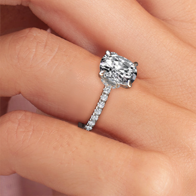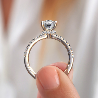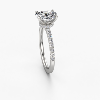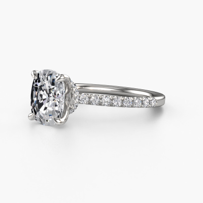 The ring shown above is called the Crystal CSH 4. We call this type of ring a pavé solitaire ring because it has one centre gemstone and a band that is also pave set with gemstones. The platinum engagement ring is set with a cushion rectangle 1.50 crt lab grown diamond centre stone and the band is pave set with lab grown diamond gemstones. Each jewel is made with passion and love by one of our master goldsmiths.This chic platinum pavé solitaire engagement ring has an exquisite cushion rectangle lab grown diamond centre stone. To further accentuate the centre stone, the band is fully set with more lab-grown diamonds. Its open prong setting allows light to strike the lab grown diamond from various angles and this adds sparkle to your lab grown diamond ring. The photo shown above depicts the goldsmith's carefully handcrafted details of the ring. The high positioning of the centre stone is truly eye-catching. The perfect engagement ring for the crown jewel of your life! By using a combination of the latest modern techniques, combined with ancient crafting, we can make all our engagement rings in our own studio. Each jewel is made to order. This is advantageous because we can offer you a price you won't find anywhere else.Our designers and goldsmiths work together each day, creating new jewels. Perhaps you have found a nice chic engagement ring somewhere, which can be used to customize your unique ring. Please feel free to contact us. We will make you an offer, based on a fair price/ quality ratio, which will amaze you.To make it easier for you, we offer a 30 day return policy. Check our terms and conditions.
