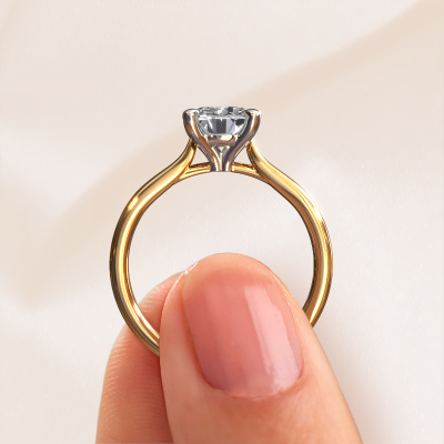 The ring shown above is called the Mignon RND 1, we call this a solitaire ring because it contains a single gemstone. The engagement ring is made in 14 Carat gold and has a round lab grown diamond of 1.50 crt. The cool thing about our configurator is that you can compile your own piece of jewellery, into a completely personalized one. This solitaire ring is crafted in the precious metals gold with white gold, but of course you are free to pick your own colours. Each piece of jewellery is made with passion and love by one of our master goldsmiths.The solitaire ring is a special type of engagement ring. Its open prong setting allows light to strike the gemstone from various angles. This classic engagement ring is a stunning eye-catcher because of the high positioning of the gemstone. In order for you to commemorate your proposal with a unique ring, we carefully adorn this solitaire ring by hand. The love of your life deserves nothing but the best. After receiving your order, our goldsmiths will passionately start the creative process of making your engagement ring in our own studio. Because we don't have a big stockpile, these costs will not be passed on to you. Our pricing is proof of that! We offer top quality jewels at lowest price, guaranteed.Have you found a specific engagement ring somewhere which you would like to give to your loved one? Please feel free to express your wishes to our jewel designers because we would be honoured to turn your design into a classic engagement ring. You can follow the development of your ring design because we use 3D drawings. This gives you a realistic preview of how your design will look. You can also preorder a dummy. A dummy is a plastic ring, which can be shaped according your ring design. You can try it on and check if its width and size are suitable for you. We will gladly send you a non-binding offer, based on a fair price/ quality ratio. It will amaze you, considering the quality of the ring and gemstones.To make it easier for you, we offer a 30 day return policy. Check our terms and conditions.