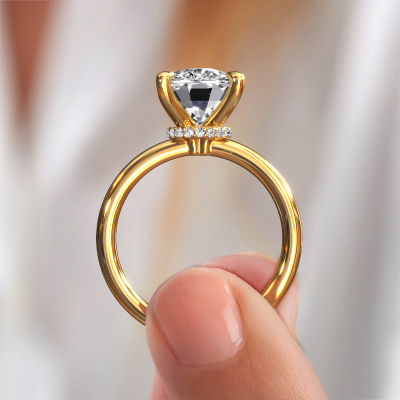 The ring shown above is called the Crystal CSH 3, we call this a solitaire ring because it contains a single gemstone. The engagement ring is made in 14 Carat gold and has a cushion rectangle lab grown diamond of 4.50 crt. The cool thing about our configurator is that you can compile your own piece of jewellery, into a completely personalized one. This solitaire ring is crafted in the precious metals gold with gold, but of course you are free to pick your own colours. Each piece of jewellery is created to add sparkle to your finger, each jewel is lovingly made by hand by our goldsmiths.The solitaire ring is a special type of engagement ring. Its open prong setting allows light to strike the gemstone from various angles. This exclusive engagement ring is a stunning eye-catcher because of the high positioning of the gemstone. In order for you to commemorate your proposal with a unique ring, we carefully adorn this solitaire ring by hand. The love of your life deserves nothing but the best. After receiving your order, our goldsmiths will start the creative process of making your Crystal CSH 3 engagement ring. We don't keep stock. This is advantageous because these costs will not be passed on to you. Therefore, we can offer jewellery at exceptionally low prices.Have you found a specific engagement ring somewhere which you would like to give to your loved one? Please feel free to express your wishes to our jewel designers because we would be honoured to turn your design into a exclusive engagement ring. You can follow the development of your ring design because we use 3D drawings. This gives you a realistic preview of how your design will look. You can also preorder a dummy. A dummy is a plastic ring, which can be shaped according your ring design. You can try it on and check if its width and size are suitable for you. We will gladly send you a non-binding offer, based on a fair price/ quality ratio. It will amaze you, considering the quality of the ring and gemstones.To make it easier for you, we offer a 30 day return policy. Check our terms and conditions.