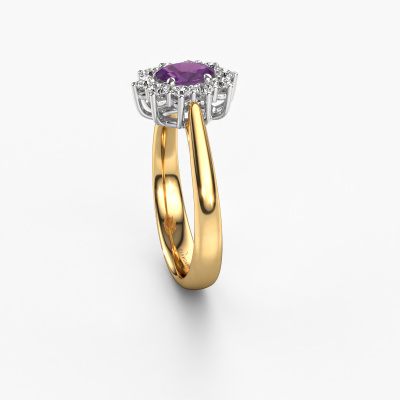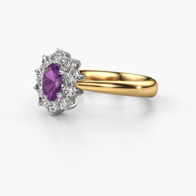 The ring shown above is called the Leesa 1. We call this type of ring a Lady Diana ring. The centre gemstone is surrounded by smaller sized stones. This 14 Carat gold version is set with a 6x4 mm oval amethyst centre stone, embraced by smaller diamonds. What makes this classic gold Lady Diana ring special is the setting of the smaller gems surrounding the centre amethyst, which are shaped like a beautiful flower. The surrounding Lady Diana of stones frame the middle centre stone in such a way to make it appear bigger. This type of engagement ring is also called a flower ring. It is very important that the smaller diamonds are positioned identically so there is no interference of light but perfect unity instead. Our skilled Goldsmiths get the job done. Each individual stone is carefully set by hand. During manufacturing, light fall is constantly monitored to make sure the special Lady Diana effect is still visible. In the end you get the perfect engagement ring with a radiant amethyst gemstone centrepiece. You can imagine the effect of a ring of such significance when you give tot the love of your life on her special day to shine. This jewel is made to shine bright around your finger. Each jewel is hand made with love by our goldsmiths.After receiving your order, our goldsmiths will start the creative process of making your Leesa 1 engagement ring. We don't keep stock. This is advantageous because these costs will not be passed on to you. Therefore, we can offer jewellery at exceptionally low prices.Have you found a specific engagement ring somewhere which you would like to give to your loved one? Please feel free to express your wishes to our jewel designers because we would be honoured to turn your design into a classic engagement ring. You can follow the development of your ring design because we use 3D drawings. This gives you a realistic preview of how your design will look. You can also preorder a dummy. A dummy is a plastic ring, which can be shaped according your ring design. You can try it on and check if its width and size are suitable for you. We will gladly send you a non-binding offer, based on a fair price/ quality ratio. It will amaze you, considering the quality of the ring and gemstones.To make it easier for you, we offer a 30 day return policy. Check our terms and conditions.