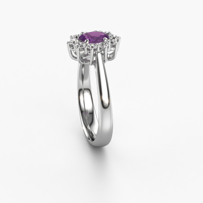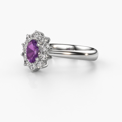 The ring shown above is called the Leesa 1. We call this type of ring a Lady Diana ring. The centre gemstone is surrounded by smaller sized stones. This 14 Carat white gold version is set with a 6x4 mm oval amethyst centre stone, embraced by smaller diamonds. What makes this classic white gold Lady Diana ring special is the setting of the smaller gems surrounding the centre amethyst, which are shaped like a beautiful flower. The surrounding Lady Diana of stones frame the middle centre stone in such a way to make it appear bigger. This type of engagement ring is also called a flower ring. It is very important that the smaller diamonds are positioned identically so there is no interference of light but perfect unity instead. Our skilled Goldsmiths get the job done. Each individual stone is carefully set by hand. During manufacturing, light fall is constantly monitored to make sure the special Lady Diana effect is still visible. In the end you get the perfect engagement ring with a radiant amethyst gemstone centrepiece. You can imagine the effect of a ring of such significance when you give tot the love of your life on her special day to shine. This jewel is made to shine bright around your finger. Each jewel is hand made with love by our goldsmiths.After receiving your order, our goldsmiths will start the creative process of making your Leesa 1 engagement ring. We don't keep stock. This is advantageous because these costs will not be passed on to you. Therefore, we can offer jewellery at exceptionally low prices.Have you found a specific engagement ring somewhere which you would like to give to your loved one? Please feel free to express your wishes to our jewel designers because we would be honoured to turn your design into a classic engagement ring. You can follow the development of your ring design because we use 3D drawings. This gives you a realistic preview of how your design will look. You can also preorder a dummy. A dummy is a plastic ring, which can be shaped according your ring design. You can try it on and check if its width and size are suitable for you. We will gladly send you a non-binding offer, based on a fair price/ quality ratio. It will amaze you, considering the quality of the ring and gemstones.To make it easier for you, we offer a 30 day return policy. Check our terms and conditions.