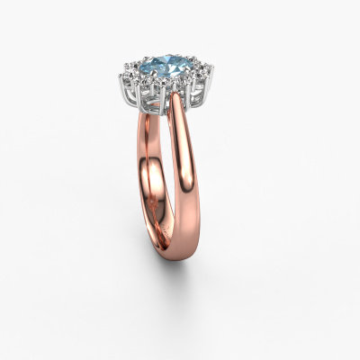 The ring shown above is called the Leesa 1. We call this type of ring a Lady Diana ring. The centre gemstone is surrounded by smaller sized stones. This 14 Carat rose gold version is set with a 6x4 mm oval blue lab grown diamond centre stone, embraced by smaller diamonds. What makes this classic rose gold Lady Diana ring special is the setting of the smaller gems surrounding the centre blue lab grown diamond, which are shaped like a beautiful flower. The surrounding Lady Diana of stones frame the middle centre stone in such a way to make it appear bigger. This type of engagement ring is also called a flower ring. It is very important that the smaller diamonds are positioned identically so there is no interference of light but perfect unity instead. Our skilled Goldsmiths get the job done. Each individual stone is carefully set by hand. During manufacturing, light fall is constantly monitored to make sure the special Lady Diana effect is still visible. In the end you get the perfect engagement ring with a radiant blue lab grown diamond gemstone centrepiece. You can imagine the effect of a ring of such significance when you give tot the love of your life on her special day to shine. This jewel is made to shine bright around your finger. Each jewel is hand made with love by our goldsmiths.After receiving your order, our goldsmiths will start the creative process of making your Leesa 1 engagement ring. We don't keep stock. This is advantageous because these costs will not be passed on to you. Therefore, we can offer jewellery at exceptionally low prices.Have you found a specific engagement ring somewhere which you would like to give to your loved one? Please feel free to express your wishes to our jewel designers because we would be honoured to turn your design into a classic engagement ring. You can follow the development of your ring design because we use 3D drawings. This gives you a realistic preview of how your design will look. You can also preorder a dummy. A dummy is a plastic ring, which can be shaped according your ring design. You can try it on and check if its width and size are suitable for you. We will gladly send you a non-binding offer, based on a fair price/ quality ratio. It will amaze you, considering the quality of the ring and gemstones.To make it easier for you, we offer a 30 day return policy. Check our terms and conditions.