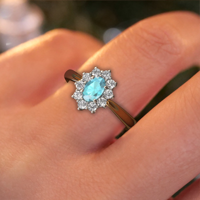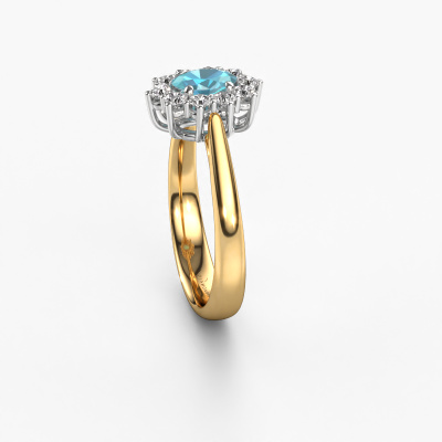 The ring shown above is called the Leesa 1. We call this type of ring a Lady Diana ring. The centre gemstone is surrounded by smaller sized stones. This 14 Carat gold version is set with a 6x4 mm oval blue topaz centre stone, embraced by smaller diamonds. What makes this classic gold Lady Diana ring special is the setting of the smaller gems surrounding the centre blue topaz, which are shaped like a beautiful flower. The surrounding Lady Diana of stones frame the middle centre stone in such a way to make it appear bigger. This type of engagement ring is also called a flower ring. It is very important that the smaller diamonds are positioned identically so there is no interference of light but perfect unity instead. Our skilled Goldsmiths get the job done. Each individual stone is carefully set by hand. During manufacturing, light fall is constantly monitored to make sure the special Lady Diana effect is still visible. In the end you get the perfect engagement ring with a radiant blue topaz gemstone centrepiece. You can imagine the effect of a ring of such significance when you give tot the love of your life on her special day to shine. This jewel is made to shine bright around your finger. Each jewel is hand made with love by our goldsmiths.After receiving your order, our goldsmiths will start the creative process of making your Leesa 1 engagement ring. We don't keep stock. This is advantageous because these costs will not be passed on to you. Therefore, we can offer jewellery at exceptionally low prices.Have you found a specific engagement ring somewhere which you would like to give to your loved one? Please feel free to express your wishes to our jewel designers because we would be honoured to turn your design into a classic engagement ring. You can follow the development of your ring design because we use 3D drawings. This gives you a realistic preview of how your design will look. You can also preorder a dummy. A dummy is a plastic ring, which can be shaped according your ring design. You can try it on and check if its width and size are suitable for you. We will gladly send you a non-binding offer, based on a fair price/ quality ratio. It will amaze you, considering the quality of the ring and gemstones.To make it easier for you, we offer a 30 day return policy. Check our terms and conditions.