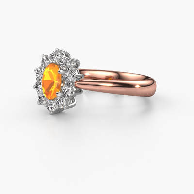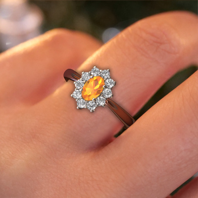 The ring shown above is called the Leesa 1. We call this type of ring a Lady Diana ring. The centre gemstone is surrounded by smaller sized stones. This 14 Carat rose gold version is set with a 6x4 mm oval citrin centre stone, embraced by smaller diamonds. What makes this classic rose gold Lady Diana ring special is the setting of the smaller gems surrounding the centre citrin, which are shaped like a beautiful flower. The surrounding Lady Diana of stones frame the middle centre stone in such a way to make it appear bigger. This type of engagement ring is also called a flower ring. It is very important that the smaller diamonds are positioned identically so there is no interference of light but perfect unity instead. Our skilled Goldsmiths get the job done. Each individual stone is carefully set by hand. During manufacturing, light fall is constantly monitored to make sure the special Lady Diana effect is still visible. In the end you get the perfect engagement ring with a radiant citrin gemstone centrepiece. You can imagine the effect of a ring of such significance when you give tot the love of your life on her special day to shine. This jewel is made to shine bright around your finger. Each jewel is hand made with love by our goldsmiths.After receiving your order, our goldsmiths will start the creative process of making your Leesa 1 engagement ring. We don't keep stock. This is advantageous because these costs will not be passed on to you. Therefore, we can offer jewellery at exceptionally low prices.Have you found a specific engagement ring somewhere which you would like to give to your loved one? Please feel free to express your wishes to our jewel designers because we would be honoured to turn your design into a classic engagement ring. You can follow the development of your ring design because we use 3D drawings. This gives you a realistic preview of how your design will look. You can also preorder a dummy. A dummy is a plastic ring, which can be shaped according your ring design. You can try it on and check if its width and size are suitable for you. We will gladly send you a non-binding offer, based on a fair price/ quality ratio. It will amaze you, considering the quality of the ring and gemstones.To make it easier for you, we offer a 30 day return policy. Check our terms and conditions.