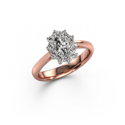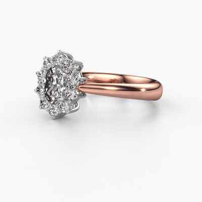The ring shown above is called the Leesa 1. We call this type of ring a Lady Diana ring. The centre gemstone is surrounded by smaller sized stones. This 14 Carat rose gold version is set with a 6x4 mm oval custom diamond centre stone, embraced by smaller diamonds. What makes this classic rose gold Lady Diana ring special is the setting of the smaller gems surrounding the centre custom diamond, which are shaped like a beautiful flower. The surrounding Lady Diana of stones frame the middle centre stone in such a way to make it appear bigger. This type of engagement ring is also called a flower ring. It is very important that the smaller diamonds are positioned identically so there is no interference of light but perfect unity instead. Our skilled Goldsmiths get the job done. Each individual stone is carefully set by hand. During manufacturing, light fall is constantly monitored to make sure the special Lady Diana effect is still visible. In the end you get the perfect engagement ring with a radiant custom diamond gemstone centrepiece. You can imagine the effect of a ring of such significance when you give tot the love of your life on her special day to shine. This jewel is made to shine bright around your finger. Each jewel is hand made with love by our goldsmiths.After receiving your order, our goldsmiths will start the creative process of making your Leesa 1 engagement ring. We don't keep stock. This is advantageous because these costs will not be passed on to you. Therefore, we can offer jewellery at exceptionally low prices.Have you found a specific engagement ring somewhere which you would like to give to your loved one? Please feel free to express your wishes to our jewel designers because we would be honoured to turn your design into a classic engagement ring. You can follow the development of your ring design because we use 3D drawings. This gives you a realistic preview of how your design will look. You can also preorder a dummy. A dummy is a plastic ring, which can be shaped according your ring design. You can try it on and check if its width and size are suitable for you. We will gladly send you a non-binding offer, based on a fair price/ quality ratio. It will amaze you, considering the quality of the ring and gemstones.To make it easier for you, we offer a 30 day return policy. Check our terms and conditions.
