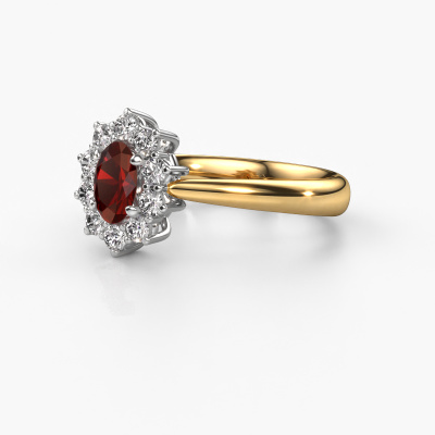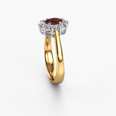 The ring shown above is called the Leesa 1. We call this type of ring a Lady Diana ring. The centre gemstone is surrounded by smaller sized stones. This 14 Carat gold version is set with a 6x4 mm oval garnet centre stone, embraced by smaller diamonds. What makes this classic gold Lady Diana ring special is the setting of the smaller gems surrounding the centre garnet, which are shaped like a beautiful flower. The surrounding Lady Diana of stones frame the middle centre stone in such a way to make it appear bigger. This type of engagement ring is also called a flower ring. It is very important that the smaller diamonds are positioned identically so there is no interference of light but perfect unity instead. Our skilled Goldsmiths get the job done. Each individual stone is carefully set by hand. During manufacturing, light fall is constantly monitored to make sure the special Lady Diana effect is still visible. In the end you get the perfect engagement ring with a radiant garnet gemstone centrepiece. You can imagine the effect of a ring of such significance when you give tot the love of your life on her special day to shine. This jewel is made to shine bright around your finger. Each jewel is hand made with love by our goldsmiths.After receiving your order, our goldsmiths will start the creative process of making your Leesa 1 engagement ring. We don't keep stock. This is advantageous because these costs will not be passed on to you. Therefore, we can offer jewellery at exceptionally low prices.Have you found a specific engagement ring somewhere which you would like to give to your loved one? Please feel free to express your wishes to our jewel designers because we would be honoured to turn your design into a classic engagement ring. You can follow the development of your ring design because we use 3D drawings. This gives you a realistic preview of how your design will look. You can also preorder a dummy. A dummy is a plastic ring, which can be shaped according your ring design. You can try it on and check if its width and size are suitable for you. We will gladly send you a non-binding offer, based on a fair price/ quality ratio. It will amaze you, considering the quality of the ring and gemstones.To make it easier for you, we offer a 30 day return policy. Check our terms and conditions.