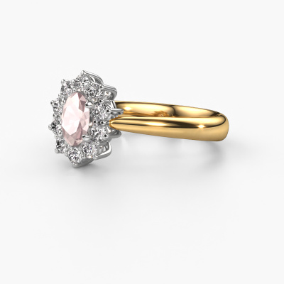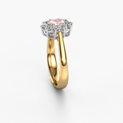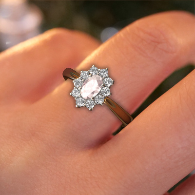 The ring shown above is called the Leesa 1. We call this type of ring a Lady Diana ring. The centre gemstone is surrounded by smaller sized stones. This 14 Carat gold version is set with a 6x4 mm oval morganite champagne centre stone, embraced by smaller diamonds. What makes this classic gold Lady Diana ring special is the setting of the smaller gems surrounding the centre morganite champagne, which are shaped like a beautiful flower. The surrounding Lady Diana of stones frame the middle centre stone in such a way to make it appear bigger. This type of engagement ring is also called a flower ring. It is very important that the smaller diamonds are positioned identically so there is no interference of light but perfect unity instead. Our skilled Goldsmiths get the job done. Each individual stone is carefully set by hand. During manufacturing, light fall is constantly monitored to make sure the special Lady Diana effect is still visible. In the end you get the perfect engagement ring with a radiant morganite champagne gemstone centrepiece. You can imagine the effect of a ring of such significance when you give tot the love of your life on her special day to shine. This jewel is made to shine bright around your finger. Each jewel is hand made with love by our goldsmiths.After receiving your order, our goldsmiths will start the creative process of making your Leesa 1 engagement ring. We don't keep stock. This is advantageous because these costs will not be passed on to you. Therefore, we can offer jewellery at exceptionally low prices.Have you found a specific engagement ring somewhere which you would like to give to your loved one? Please feel free to express your wishes to our jewel designers because we would be honoured to turn your design into a classic engagement ring. You can follow the development of your ring design because we use 3D drawings. This gives you a realistic preview of how your design will look. You can also preorder a dummy. A dummy is a plastic ring, which can be shaped according your ring design. You can try it on and check if its width and size are suitable for you. We will gladly send you a non-binding offer, based on a fair price/ quality ratio. It will amaze you, considering the quality of the ring and gemstones.To make it easier for you, we offer a 30 day return policy. Check our terms and conditions.