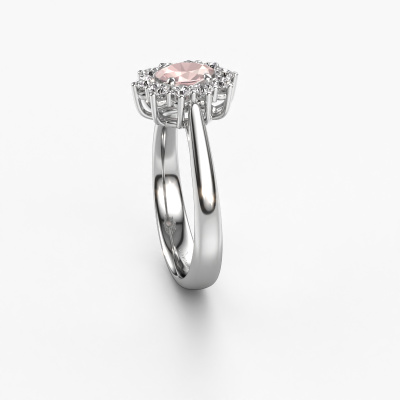 The ring shown above is called the Leesa 1. We call this type of ring a Lady Diana ring. The centre gemstone is surrounded by smaller sized stones. This 14 Carat white gold version is set with a 6x4 mm oval morganite champagne centre stone, embraced by smaller diamonds. What makes this classic white gold Lady Diana ring special is the setting of the smaller gems surrounding the centre morganite champagne, which are shaped like a beautiful flower. The surrounding Lady Diana of stones frame the middle centre stone in such a way to make it appear bigger. This type of engagement ring is also called a flower ring. It is very important that the smaller diamonds are positioned identically so there is no interference of light but perfect unity instead. Our skilled Goldsmiths get the job done. Each individual stone is carefully set by hand. During manufacturing, light fall is constantly monitored to make sure the special Lady Diana effect is still visible. In the end you get the perfect engagement ring with a radiant morganite champagne gemstone centrepiece. You can imagine the effect of a ring of such significance when you give tot the love of your life on her special day to shine. This jewel is made to shine bright around your finger. Each jewel is hand made with love by our goldsmiths.After receiving your order, our goldsmiths will start the creative process of making your Leesa 1 engagement ring. We don't keep stock. This is advantageous because these costs will not be passed on to you. Therefore, we can offer jewellery at exceptionally low prices.Have you found a specific engagement ring somewhere which you would like to give to your loved one? Please feel free to express your wishes to our jewel designers because we would be honoured to turn your design into a classic engagement ring. You can follow the development of your ring design because we use 3D drawings. This gives you a realistic preview of how your design will look. You can also preorder a dummy. A dummy is a plastic ring, which can be shaped according your ring design. You can try it on and check if its width and size are suitable for you. We will gladly send you a non-binding offer, based on a fair price/ quality ratio. It will amaze you, considering the quality of the ring and gemstones.To make it easier for you, we offer a 30 day return policy. Check our terms and conditions.