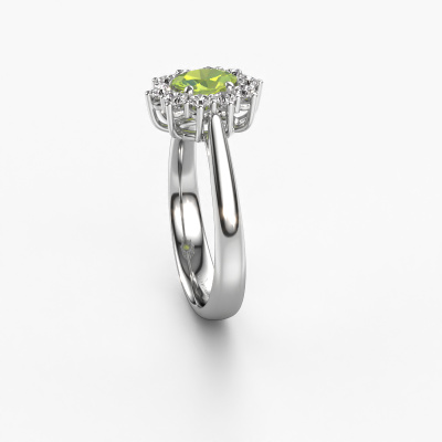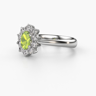 The ring shown above is called the Leesa 1. We call this type of ring a Lady Diana ring. The centre gemstone is surrounded by smaller sized stones. This 14 Carat white gold version is set with a 6x4 mm oval peridot centre stone, embraced by smaller diamonds. What makes this classic white gold Lady Diana ring special is the setting of the smaller gems surrounding the centre peridot, which are shaped like a beautiful flower. The surrounding Lady Diana of stones frame the middle centre stone in such a way to make it appear bigger. This type of engagement ring is also called a flower ring. It is very important that the smaller diamonds are positioned identically so there is no interference of light but perfect unity instead. Our skilled Goldsmiths get the job done. Each individual stone is carefully set by hand. During manufacturing, light fall is constantly monitored to make sure the special Lady Diana effect is still visible. In the end you get the perfect engagement ring with a radiant peridot gemstone centrepiece. You can imagine the effect of a ring of such significance when you give tot the love of your life on her special day to shine. This jewel is made to shine bright around your finger. Each jewel is hand made with love by our goldsmiths.After receiving your order, our goldsmiths will start the creative process of making your Leesa 1 engagement ring. We don't keep stock. This is advantageous because these costs will not be passed on to you. Therefore, we can offer jewellery at exceptionally low prices.Have you found a specific engagement ring somewhere which you would like to give to your loved one? Please feel free to express your wishes to our jewel designers because we would be honoured to turn your design into a classic engagement ring. You can follow the development of your ring design because we use 3D drawings. This gives you a realistic preview of how your design will look. You can also preorder a dummy. A dummy is a plastic ring, which can be shaped according your ring design. You can try it on and check if its width and size are suitable for you. We will gladly send you a non-binding offer, based on a fair price/ quality ratio. It will amaze you, considering the quality of the ring and gemstones.To make it easier for you, we offer a 30 day return policy. Check our terms and conditions.