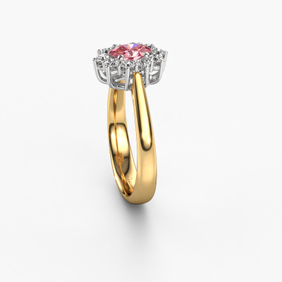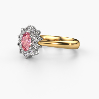 The ring shown above is called the Leesa 1. We call this type of ring a Lady Diana ring. The centre gemstone is surrounded by smaller sized stones. This 14 Carat gold version is set with a 6x4 mm oval pink lab grown diamond centre stone, embraced by smaller diamonds. What makes this classic gold Lady Diana ring special is the setting of the smaller gems surrounding the centre pink lab grown diamond, which are shaped like a beautiful flower. The surrounding Lady Diana of stones frame the middle centre stone in such a way to make it appear bigger. This type of engagement ring is also called a flower ring. It is very important that the smaller diamonds are positioned identically so there is no interference of light but perfect unity instead. Our skilled Goldsmiths get the job done. Each individual stone is carefully set by hand. During manufacturing, light fall is constantly monitored to make sure the special Lady Diana effect is still visible. In the end you get the perfect engagement ring with a radiant pink lab grown diamond gemstone centrepiece. You can imagine the effect of a ring of such significance when you give tot the love of your life on her special day to shine. This jewel is made to shine bright around your finger. Each jewel is hand made with love by our goldsmiths.After receiving your order, our goldsmiths will start the creative process of making your Leesa 1 engagement ring. We don't keep stock. This is advantageous because these costs will not be passed on to you. Therefore, we can offer jewellery at exceptionally low prices.Have you found a specific engagement ring somewhere which you would like to give to your loved one? Please feel free to express your wishes to our jewel designers because we would be honoured to turn your design into a classic engagement ring. You can follow the development of your ring design because we use 3D drawings. This gives you a realistic preview of how your design will look. You can also preorder a dummy. A dummy is a plastic ring, which can be shaped according your ring design. You can try it on and check if its width and size are suitable for you. We will gladly send you a non-binding offer, based on a fair price/ quality ratio. It will amaze you, considering the quality of the ring and gemstones.To make it easier for you, we offer a 30 day return policy. Check our terms and conditions.