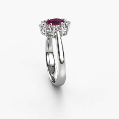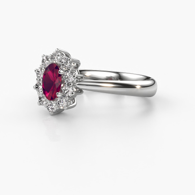 The ring shown above is called the Leesa 1. We call this type of ring a Lady Diana ring. The centre gemstone is surrounded by smaller sized stones. This 14 Carat white gold version is set with a 6x4 mm oval rhodolite centre stone, embraced by smaller diamonds. What makes this classic white gold Lady Diana ring special is the setting of the smaller gems surrounding the centre rhodolite, which are shaped like a beautiful flower. The surrounding Lady Diana of stones frame the middle centre stone in such a way to make it appear bigger. This type of engagement ring is also called a flower ring. It is very important that the smaller diamonds are positioned identically so there is no interference of light but perfect unity instead. Our skilled Goldsmiths get the job done. Each individual stone is carefully set by hand. During manufacturing, light fall is constantly monitored to make sure the special Lady Diana effect is still visible. In the end you get the perfect engagement ring with a radiant rhodolite gemstone centrepiece. You can imagine the effect of a ring of such significance when you give tot the love of your life on her special day to shine. This jewel is made to shine bright around your finger. Each jewel is hand made with love by our goldsmiths.After receiving your order, our goldsmiths will start the creative process of making your Leesa 1 engagement ring. We don't keep stock. This is advantageous because these costs will not be passed on to you. Therefore, we can offer jewellery at exceptionally low prices.Have you found a specific engagement ring somewhere which you would like to give to your loved one? Please feel free to express your wishes to our jewel designers because we would be honoured to turn your design into a classic engagement ring. You can follow the development of your ring design because we use 3D drawings. This gives you a realistic preview of how your design will look. You can also preorder a dummy. A dummy is a plastic ring, which can be shaped according your ring design. You can try it on and check if its width and size are suitable for you. We will gladly send you a non-binding offer, based on a fair price/ quality ratio. It will amaze you, considering the quality of the ring and gemstones.To make it easier for you, we offer a 30 day return policy. Check our terms and conditions.