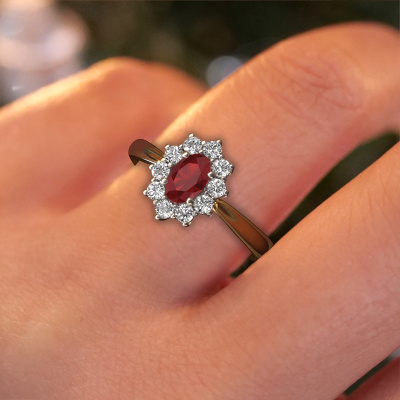 The ring shown above is called the Leesa 1. We call this type of ring a Lady Diana ring. The centre gemstone is surrounded by smaller sized stones. This 14 Carat gold version is set with a 6x4 mm oval ruby centre stone, embraced by smaller diamonds. What makes this classic gold Lady Diana ring special is the setting of the smaller gems surrounding the centre ruby, which are shaped like a beautiful flower. The surrounding Lady Diana of stones frame the middle centre stone in such a way to make it appear bigger. This type of engagement ring is also called a flower ring. It is very important that the smaller diamonds are positioned identically so there is no interference of light but perfect unity instead. Our skilled Goldsmiths get the job done. Each individual stone is carefully set by hand. During manufacturing, light fall is constantly monitored to make sure the special Lady Diana effect is still visible. In the end you get the perfect engagement ring with a radiant ruby gemstone centrepiece. You can imagine the effect of a ring of such significance when you give tot the love of your life on her special day to shine. This jewel is made to shine bright around your finger. Each jewel is hand made with love by our goldsmiths.After receiving your order, our goldsmiths will start the creative process of making your Leesa 1 engagement ring. We don't keep stock. This is advantageous because these costs will not be passed on to you. Therefore, we can offer jewellery at exceptionally low prices.Have you found a specific engagement ring somewhere which you would like to give to your loved one? Please feel free to express your wishes to our jewel designers because we would be honoured to turn your design into a classic engagement ring. You can follow the development of your ring design because we use 3D drawings. This gives you a realistic preview of how your design will look. You can also preorder a dummy. A dummy is a plastic ring, which can be shaped according your ring design. You can try it on and check if its width and size are suitable for you. We will gladly send you a non-binding offer, based on a fair price/ quality ratio. It will amaze you, considering the quality of the ring and gemstones.To make it easier for you, we offer a 30 day return policy. Check our terms and conditions.
