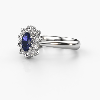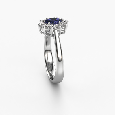 The ring shown above is called the Leesa 1. We call this type of ring a Lady Diana ring. The centre gemstone is surrounded by smaller sized stones. This 14 Carat white gold version is set with a 6x4 mm oval sapphire centre stone, embraced by smaller diamonds. What makes this classic white gold Lady Diana ring special is the setting of the smaller gems surrounding the centre sapphire, which are shaped like a beautiful flower. The surrounding Lady Diana of stones frame the middle centre stone in such a way to make it appear bigger. This type of engagement ring is also called a flower ring. It is very important that the smaller diamonds are positioned identically so there is no interference of light but perfect unity instead. Our skilled Goldsmiths get the job done. Each individual stone is carefully set by hand. During manufacturing, light fall is constantly monitored to make sure the special Lady Diana effect is still visible. In the end you get the perfect engagement ring with a radiant sapphire gemstone centrepiece. You can imagine the effect of a ring of such significance when you give tot the love of your life on her special day to shine. This jewel is made to shine bright around your finger. Each jewel is hand made with love by our goldsmiths.After receiving your order, our goldsmiths will start the creative process of making your Leesa 1 engagement ring. We don't keep stock. This is advantageous because these costs will not be passed on to you. Therefore, we can offer jewellery at exceptionally low prices.Have you found a specific engagement ring somewhere which you would like to give to your loved one? Please feel free to express your wishes to our jewel designers because we would be honoured to turn your design into a classic engagement ring. You can follow the development of your ring design because we use 3D drawings. This gives you a realistic preview of how your design will look. You can also preorder a dummy. A dummy is a plastic ring, which can be shaped according your ring design. You can try it on and check if its width and size are suitable for you. We will gladly send you a non-binding offer, based on a fair price/ quality ratio. It will amaze you, considering the quality of the ring and gemstones.To make it easier for you, we offer a 30 day return policy. Check our terms and conditions.