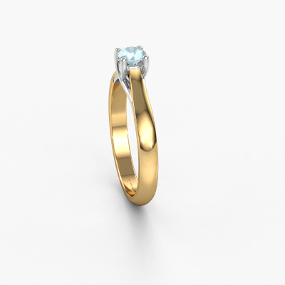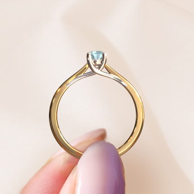 The ring shown above is called the Mia 1. We call this a solitaire ring because it contains a single gemstone. The engagement ring is made in 14 Carat gold and has a round aquamarine of 4 mm. This extraordinary modern gold solitaire engagement ring is set with a beautiful round aquamarine to add sparkle to your proposal. The open prong setting allows light to strike the gemstone from various angles. Did you know a diamond represents everlasting love and fidelity? This makes it a perfect centrepiece. Our goldsmith carefully positions the gemstone of your choosing high on top of the ring, which makes it stand out. Each piece of jewellery is made just for you by our master goldsmiths in our own studio.By using our modern techniques, we can design and customize the finest quality jewels with the utmost care for you. Our engagement rings are always priced 30 percent lower than other jewellers. We make engagement rings to order so we don't have to maintain a large stock. If you have a certain budget, we are more than happy to advice you accordingly.Our designers and goldsmiths work together each day, creating new jewels. Perhaps you have found a nice modern engagement ring somewhere, which can be used to customize your unique ring. Please feel free to contact us. We will make you an offer, based on a fair price/ quality ratio, which will amaze you.To make it easier for you, we offer a 30 day return policy. Check our terms and conditions.