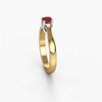 The ring shown above is called the Mia 1. We call this a solitaire ring because it contains a single gemstone. The engagement ring is made in 14 Carat gold and has a round ruby of 4 mm. This extraordinary modern gold solitaire engagement ring is set with a beautiful round ruby to add sparkle to your proposal. The open prong setting allows light to strike the gemstone from various angles. Did you know a diamond represents everlasting love and fidelity? This makes it a perfect centrepiece. Our goldsmith carefully positions the gemstone of your choosing high on top of the ring, which makes it stand out. Each piece of jewellery is made just for you by our master goldsmiths in our own studio.By using our modern techniques, we can design and customize the finest quality jewels with the utmost care for you. Our engagement rings are always priced 30 percent lower than other jewellers. We make engagement rings to order so we don't have to maintain a large stock. If you have a certain budget, we are more than happy to advice you accordingly.Our designers and goldsmiths work together each day, creating new jewels. Perhaps you have found a nice modern engagement ring somewhere, which can be used to customize your unique ring. Please feel free to contact us. We will make you an offer, based on a fair price/ quality ratio, which will amaze you.To make it easier for you, we offer a 30 day return policy. Check our terms and conditions.