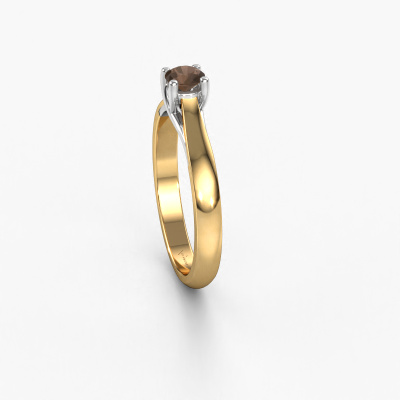 The ring shown above is called the Mia 1. We call this a solitaire ring because it contains a single gemstone. The engagement ring is made in 14 Carat gold and has a round smokey quartz of 4 mm. This extraordinary modern gold solitaire engagement ring is set with a beautiful round smokey quartz to add sparkle to your proposal. The open prong setting allows light to strike the gemstone from various angles. Did you know a diamond represents everlasting love and fidelity? This makes it a perfect centrepiece. Our goldsmith carefully positions the gemstone of your choosing high on top of the ring, which makes it stand out. Each piece of jewellery is made just for you by our master goldsmiths in our own studio.By using our modern techniques, we can design and customize the finest quality jewels with the utmost care for you. Our engagement rings are always priced 30 percent lower than other jewellers. We make engagement rings to order so we don't have to maintain a large stock. If you have a certain budget, we are more than happy to advice you accordingly.Our designers and goldsmiths work together each day, creating new jewels. Perhaps you have found a nice modern engagement ring somewhere, which can be used to customize your unique ring. Please feel free to contact us. We will make you an offer, based on a fair price/ quality ratio, which will amaze you.To make it easier for you, we offer a 30 day return policy. Check our terms and conditions.
