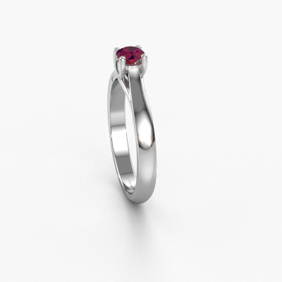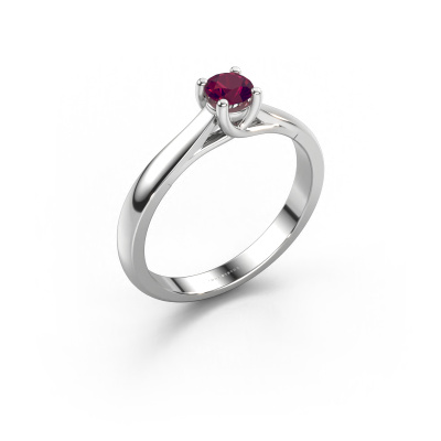 The ring shown above is called the Mia 1. We call this a solitaire ring because it contains a single gemstone. The engagement ring is made in platinum and has a round rhodolite of 4 mm. This extraordinary modern platinum solitaire engagement ring is set with a beautiful round rhodolite to add sparkle to your proposal. The open prong setting allows light to strike the gemstone from various angles. Did you know a diamond represents everlasting love and fidelity? This makes it a perfect centrepiece. Our goldsmith carefully positions the gemstone of your choosing high on top of the ring, which makes it stand out. Each piece of jewellery is made just for you by our master goldsmiths in our own studio.By using our modern techniques, we can design and customize the finest quality jewels with the utmost care for you. Our engagement rings are always priced 30 percent lower than other jewellers. We make engagement rings to order so we don't have to maintain a large stock. If you have a certain budget, we are more than happy to advice you accordingly.Our designers and goldsmiths work together each day, creating new jewels. Perhaps you have found a nice modern engagement ring somewhere, which can be used to customize your unique ring. Please feel free to contact us. We will make you an offer, based on a fair price/ quality ratio, which will amaze you.To make it easier for you, we offer a 30 day return policy. Check our terms and conditions.