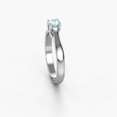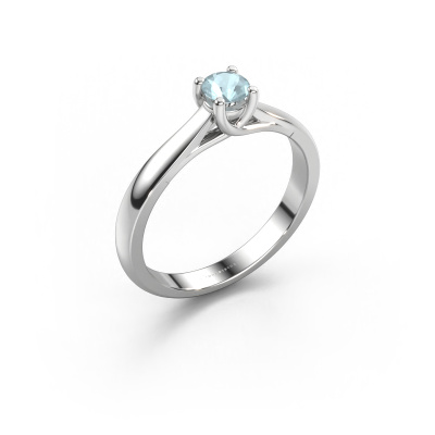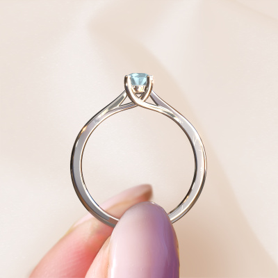 The ring shown above is called the Mia 1. We call this a solitaire ring because it contains a single gemstone. The engagement ring is made in 14 Carat white gold and has a round aquamarine of 4 mm. This extraordinary modern white gold solitaire engagement ring is set with a beautiful round aquamarine to add sparkle to your proposal. The open prong setting allows light to strike the gemstone from various angles. Did you know a diamond represents everlasting love and fidelity? This makes it a perfect centrepiece. Our goldsmith carefully positions the gemstone of your choosing high on top of the ring, which makes it stand out. Each piece of jewellery is made just for you by our master goldsmiths in our own studio.By using our modern techniques, we can design and customize the finest quality jewels with the utmost care for you. Our engagement rings are always priced 30 percent lower than other jewellers. We make engagement rings to order so we don't have to maintain a large stock. If you have a certain budget, we are more than happy to advice you accordingly.Our designers and goldsmiths work together each day, creating new jewels. Perhaps you have found a nice modern engagement ring somewhere, which can be used to customize your unique ring. Please feel free to contact us. We will make you an offer, based on a fair price/ quality ratio, which will amaze you.To make it easier for you, we offer a 30 day return policy. Check our terms and conditions.