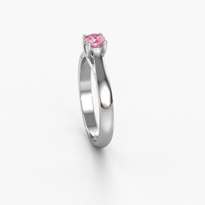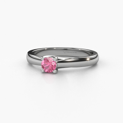 The ring shown above is called the Mia 1. We call this a solitaire ring because it contains a single gemstone. The engagement ring is made in 14 Carat white gold and has a round pink sapphire of 4 mm. This extraordinary modern white gold solitaire engagement ring is set with a beautiful round pink sapphire to add sparkle to your proposal. The open prong setting allows light to strike the gemstone from various angles. Did you know a diamond represents everlasting love and fidelity? This makes it a perfect centrepiece. Our goldsmith carefully positions the gemstone of your choosing high on top of the ring, which makes it stand out. Each piece of jewellery is made just for you by our master goldsmiths in our own studio.By using our modern techniques, we can design and customize the finest quality jewels with the utmost care for you. Our engagement rings are always priced 30 percent lower than other jewellers. We make engagement rings to order so we don't have to maintain a large stock. If you have a certain budget, we are more than happy to advice you accordingly.Our designers and goldsmiths work together each day, creating new jewels. Perhaps you have found a nice modern engagement ring somewhere, which can be used to customize your unique ring. Please feel free to contact us. We will make you an offer, based on a fair price/ quality ratio, which will amaze you.To make it easier for you, we offer a 30 day return policy. Check our terms and conditions.
