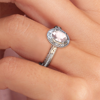 This platinum ring is called Alice OVL and is set with 7x5 mm morganite champagne. What is it that makes your relationship unique? What is it about her that makes you want to bend down on one knee? The unique bond between the two of you is emphasized by an equally unique ring. A one of a kind filigree halo engagement ring made especially for her. That is why this vintage ring fits her like a glove. Each specific detail of this filigree platinum morganite champagne set engagement ring is hand-picked, crafted and polished by our expert goldsmith. The result is an exquisite ring, unique and perfectly crafted to perfection. That is what our expert Goldsmiths strive for. This jewel is made with passion and love by one of our master goldsmiths.By using our modern techniques, we can design and customize the finest quality jewels with the utmost care for you. Our engagement rings are always priced 30 percent lower than other jewellers. We make engagement rings to order so we don't have to maintain a large stock. If you have a certain budget, we are more than happy to advice you accordingly.Our team adds new designs to our online collection daily. Our designers and goldsmiths work together in creating the best design. We strive to offer a diverse collection of jewels. Perhaps you have a specific jewel design in mind. One you came across somewhere. Please contact us for a free consultation. We will make you an offer, based on a fair price/ quality ratio, that will baffle you.To make it easier for you, we offer a 30 day return policy. Check our terms and conditions.