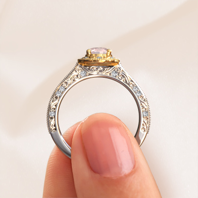 This 14 Carat white gold ring is called Alice OVL and is set with 7x5 mm morganite champagne. What is it that makes your relationship unique? What is it about her that makes you want to bend down on one knee? The unique bond between the two of you is emphasized by an equally unique ring. A one of a kind filigree halo engagement ring made especially for her. That is why this vintage ring fits her like a glove. Each specific detail of this filigree white gold morganite champagne set engagement ring is hand-picked, crafted and polished by our expert goldsmith. The result is an exquisite ring, unique and perfectly crafted to perfection. That is what our expert Goldsmiths strive for. This jewel is made with passion and love by one of our master goldsmiths.By using our modern techniques, we can design and customize the finest quality jewels with the utmost care for you. Our engagement rings are always priced 30 percent lower than other jewellers. We make engagement rings to order so we don't have to maintain a large stock. If you have a certain budget, we are more than happy to advice you accordingly.Our team adds new designs to our online collection daily. Our designers and goldsmiths work together in creating the best design. We strive to offer a diverse collection of jewels. Perhaps you have a specific jewel design in mind. One you came across somewhere. Please contact us for a free consultation. We will make you an offer, based on a fair price/ quality ratio, that will baffle you.To make it easier for you, we offer a 30 day return policy. Check our terms and conditions.