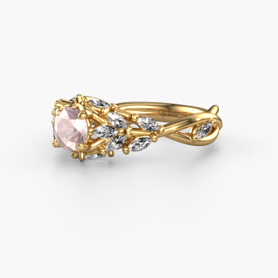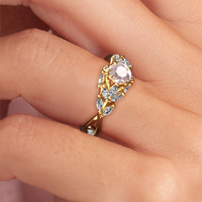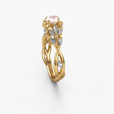 The ring shown above is called the Samantha RND. We call this type of ring a pavé solitaire ring because it has one centre gemstone and a band that is also pave set with gemstones. This engagement ring is made in 14 Carat gold set with a 5 mm round morganite champagne, and pave set diamonds at the sides. Each piece of jewellery is made with passion and love by one of our master goldsmiths.This contemporary gold pavé solitaire engagement ring has an exquisite round morganite champagne centre stone. To further accentuate the centre stone, the band is set full with more diamonds. Its open prong setting allows light to strike the morganite champagne from various angles and this adds sparkle to your morganite champagne ring. The photo shown above depicts the goldsmith's carefully handcrafted details of the ring. The high positioning of the centre stone is truly eye-catching. The perfect engagement ring for the crown jewel of your life!By using a combination of the latest modern techniques, combined with ancient crafting, we can make all our engagement rings in our own studio. Each jewel is made to order. This is advantageous because we can offer you a price you won't find anywhere else.Our designers and goldsmiths work together each day, creating new jewels. Perhaps you have found a nice contemporary engagement ring somewhere, which can be used to customize your unique ring. Please feel free to contact us. We will make you an offer, based on a fair price/ quality ratio, which will amaze you.To make it easier for you, we offer a 30 day return policy. Check our terms and conditions.