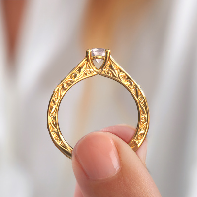 The ring shown above is called the Mallory rnd. We call this type of ring a pavé solitaire ring because it has one centre gemstone and a band that is also pave set with gemstones. This engagement ring is made in 14 Carat gold set with a 5 mm round morganite champagne, and pave set lab-grown diamonds at the sides. Each piece of jewellery is made just for you by our master goldsmiths in our own studio.This vintage gold pavé solitaire engagement ring has an exquisite round morganite champagne centre stone. To further accentuate the centre stone, the band is set full with more lab-grown diamonds. Its open prong setting allows light to strike the morganite champagne from various angles and this adds sparkle to your morganite champagne ring. The photo shown above depicts the goldsmith's carefully handcrafted details of the ring. The high positioning of the centre stone is truly eye-catching. The perfect engagement ring for the crown jewel of your life!Because we design and deliver our own rings, we can offer you a engagement ring at a price you won't find anywhere else. A ring is made to order, which helps prevent excess supplies, so we can make you a great price offer. We understand it feels risky, buying your engagement ring online, but we will gladly assist in the designing process, taking your budget into consideration.Different styles of new rings are made daily by our team. Perhaps you have found a pavé solitaire engagement ring somewhere. One you would like to give to your loved one. Please feel free to share your thoughts and design with our jewel designers. We would love to turn your design into a vintage engagement ring. You can follow the development of your ring design because we use very detailed 3D drawings. On top of that, you can order a dummy of the design. A dummy is a plastic ring, which can be shaped according your ring design. You can try it on and check if the engagement ring is up to standard. We will gladly send you a non-binding offer, based on a fair price/ quality ratio. The offer will baffle you, considering the quality of the ring and gemstones.To make it easier for you, we offer a 30 day return policy. Check our terms and conditions.
