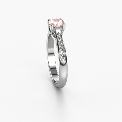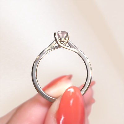 The ring shown above is called the Mia 2. We call this type of ring a pavé solitaire ring because it has one centre gemstone and a band that is also pave set with gemstones. This engagement ring is made in platinum set with a 5 mm round morganite champagne, and pave set lab-grown diamonds at the sides. Each piece of jewellery is made just for you, with attention to detail and design.This modern platinum pavé solitaire engagement ring has an exquisite round morganite champagne centre stone. To further accentuate the centre stone, the band is set full with more lab-grown diamonds. Its open prong setting allows light to strike the morganite champagne from various angles and this adds sparkle to your morganite champagne ring. The photo shown above depicts the goldsmith's carefully handcrafted details of the ring. The high positioning of the centre stone is truly eye-catching. The perfect engagement ring for the crown jewel of your life!By using our modern techniques, we can design and customize the finest quality jewels with the utmost care for you. Our engagement rings are always priced 30 percent lower than other jewellers. We make engagement rings to order so we don't have to maintain a large stock. If you have a certain budget, we are more than happy to advice you accordingly.Different styles of new rings are made daily by our team. Perhaps you have found a pavé solitaire engagement ring somewhere. One you would like to give to your loved one. Please feel free to share your thoughts and design with our jewel designers. We would love to turn your design into a modern engagement ring. You can follow the development of your ring design because we use very detailed 3D drawings. On top of that, you can order a dummy of the design. A dummy is a plastic ring, which can be shaped according your ring design. You can try it on and check if the engagement ring is up to standard. We will gladly send you a non-binding offer, based on a fair price/ quality ratio. The offer will baffle you, considering the quality of the ring and gemstones.To make it easier for you, we offer a 30 day return policy. Check our terms and conditions.