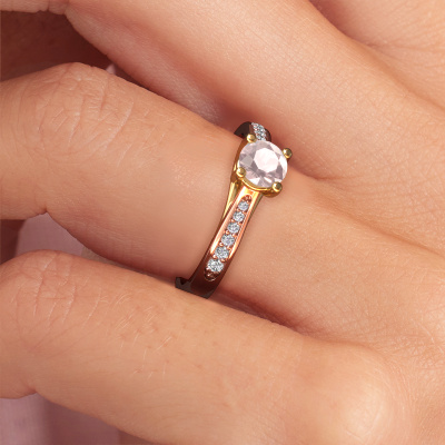 The ring shown above is called the Mia 2. We call this type of ring a pavé solitaire ring because it has one centre gemstone and a band that is also pave set with gemstones. This engagement ring is made in 14 Carat rose gold set with a 5 mm round morganite champagne, and pave set lab-grown diamonds at the sides. Each piece of jewellery is made just for you, with attention to detail and design.This modern rose gold pavé solitaire engagement ring has an exquisite round morganite champagne centre stone. To further accentuate the centre stone, the band is set full with more lab-grown diamonds. Its open prong setting allows light to strike the morganite champagne from various angles and this adds sparkle to your morganite champagne ring. The photo shown above depicts the goldsmith's carefully handcrafted details of the ring. The high positioning of the centre stone is truly eye-catching. The perfect engagement ring for the crown jewel of your life!By using our modern techniques, we can design and customize the finest quality jewels with the utmost care for you. Our engagement rings are always priced 30 percent lower than other jewellers. We make engagement rings to order so we don't have to maintain a large stock. If you have a certain budget, we are more than happy to advice you accordingly.Different styles of new rings are made daily by our team. Perhaps you have found a pavé solitaire engagement ring somewhere. One you would like to give to your loved one. Please feel free to share your thoughts and design with our jewel designers. We would love to turn your design into a modern engagement ring. You can follow the development of your ring design because we use very detailed 3D drawings. On top of that, you can order a dummy of the design. A dummy is a plastic ring, which can be shaped according your ring design. You can try it on and check if the engagement ring is up to standard. We will gladly send you a non-binding offer, based on a fair price/ quality ratio. The offer will baffle you, considering the quality of the ring and gemstones.To make it easier for you, we offer a 30 day return policy. Check our terms and conditions.