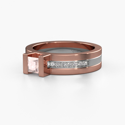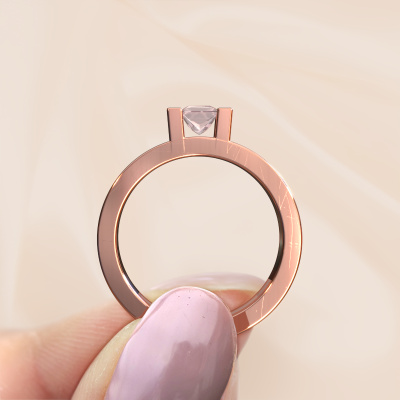 The ring shown above is called the Desire. We call this type of ring a pavé solitaire ring because it has one centre gemstone and a band that is also pave set with gemstones. The 14 Carat rose gold engagement ring is set with a princess 4 mm morganite champagne centre stone and the band is pave set with diamond gemstones. Each jewel is made just for you by our master goldsmiths in our own studio.This modern rose gold pavé solitaire engagement ring has an exquisite princess morganite champagne centre stone. To further accentuate the centre stone, the band is fully set with more diamonds. Its open prong setting allows light to strike the morganite champagne from various angles and this adds sparkle to your morganite champagne ring. The photo shown above depicts the goldsmith's carefully handcrafted details of the ring. The high positioning of the centre stone is truly eye-catching. The perfect engagement ring for the crown jewel of your life! By using a combination of the latest modern techniques, combined with ancient crafting, we can make all our engagement rings in our own studio. Each jewel is made to order. This is advantageous because we can offer you a price you won't find anywhere else.Have you found a specific engagement ring somewhere which you would like to give to your loved one? Please feel free to express your wishes to our jewel designers because we would be honoured to turn your design into a modern engagement ring. You can follow the development of your ring design because we use 3D drawings. This gives you a realistic preview of how your design will look. You can also preorder a dummy. A dummy is a plastic ring, which can be shaped according your ring design. You can try it on and check if its width and size are suitable for you. We will gladly send you a non-binding offer, based on a fair price/ quality ratio. It will amaze you, considering the quality of the ring and gemstones.To make it easier for you, we offer a 30 day return policy. Check our terms and conditions.
