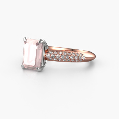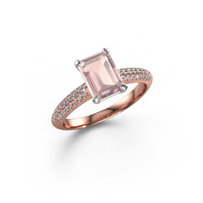 The ring shown above is called the Morane EME. We call this type of ring a pavé solitaire ring because it has one centre gemstone and a band that is also pave set with gemstones. The 14 Carat rose gold engagement ring is set with a emerald cut 8x6 mm morganite champagne centre stone and the band is pave set with lab grown diamond gemstones. Each jewel is made just for you by our master goldsmiths in our own studio.This unique rose gold pavé solitaire engagement ring has an exquisite emerald cut morganite champagne centre stone. To further accentuate the centre stone, the band is fully set with more lab-grown diamonds. Its open prong setting allows light to strike the morganite champagne from various angles and this adds sparkle to your morganite champagne ring. The photo shown above depicts the goldsmith's carefully handcrafted details of the ring. The high positioning of the centre stone is truly eye-catching. The perfect engagement ring for the crown jewel of your life! After receiving your order, our goldsmiths will passionately start the creative process of making your engagement ring in our own studio. Because we don't have a big stockpile, these costs will not be passed on to you. Our pricing is proof of that! We offer top quality jewels at lowest price, guaranteed.Our team adds new designs to our online collection daily. Our designers and goldsmiths work together in creating the best design. We strive to offer a diverse collection of jewels. Perhaps you have a specific jewel design in mind. One you came across somewhere. Please contact us for a free consultation. We will make you an offer, based on a fair price/ quality ratio, that will baffle you.To make it easier for you, we offer a 30 day return policy. Check our terms and conditions.