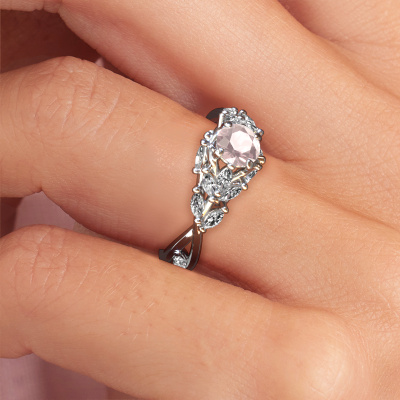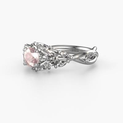 The ring shown above is called the Samantha RND. We call this type of ring a pavé solitaire ring because it has one centre gemstone and a band that is also pave set with gemstones. This engagement ring is made in 14 Carat white gold set with a 5 mm round morganite champagne, and pave set diamonds at the sides. Each piece of jewellery is made with passion and love by one of our master goldsmiths.This contemporary white gold pavé solitaire engagement ring has an exquisite round morganite champagne centre stone. To further accentuate the centre stone, the band is set full with more diamonds. Its open prong setting allows light to strike the morganite champagne from various angles and this adds sparkle to your morganite champagne ring. The photo shown above depicts the goldsmith's carefully handcrafted details of the ring. The high positioning of the centre stone is truly eye-catching. The perfect engagement ring for the crown jewel of your life!By using a combination of the latest modern techniques, combined with ancient crafting, we can make all our engagement rings in our own studio. Each jewel is made to order. This is advantageous because we can offer you a price you won't find anywhere else.Our designers and goldsmiths work together each day, creating new jewels. Perhaps you have found a nice contemporary engagement ring somewhere, which can be used to customize your unique ring. Please feel free to contact us. We will make you an offer, based on a fair price/ quality ratio, which will amaze you.To make it easier for you, we offer a 30 day return policy. Check our terms and conditions.