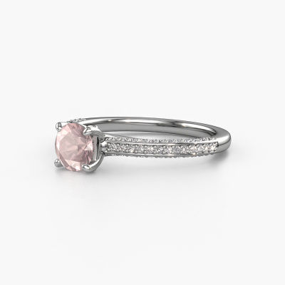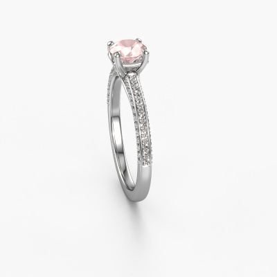 The ring shown above is called the Elenore rnd. We call this type of ring a pavé solitaire ring because it has one centre gemstone and a band that is also pave set with gemstones. This engagement ring is made in 14 Carat white gold set with a 5.4 mm round morganite champagne, and pave set lab-grown diamonds at the sides. Each piece of jewellery is made just for you by our master goldsmiths in our own studio.This exclusive white gold pavé solitaire engagement ring has an exquisite round morganite champagne centre stone. To further accentuate the centre stone, the band is set full with more lab-grown diamonds. Its open prong setting allows light to strike the morganite champagne from various angles and this adds sparkle to your morganite champagne ring. The photo shown above depicts the goldsmith's carefully handcrafted details of the ring. The high positioning of the centre stone is truly eye-catching. The perfect engagement ring for the crown jewel of your life!By using a combination of the latest modern techniques, combined with ancient crafting, we can make all our engagement rings in our own studio. Each jewel is made to order. This is advantageous because we can offer you a price you won't find anywhere else.Have you found a specific engagement ring somewhere which you would like to give to your loved one? Please feel free to express your wishes to our jewel designers because we would be honoured to turn your design into a exclusive engagement ring. You can follow the development of your ring design because we use 3D drawings. This gives you a realistic preview of how your design will look. You can also preorder a dummy. A dummy is a plastic ring, which can be shaped according your ring design. You can try it on and check if its width and size are suitable for you. We will gladly send you a non-binding offer, based on a fair price/ quality ratio. It will amaze you, considering the quality of the ring and gemstones.To make it easier for you, we offer a 30 day return policy. Check our terms and conditions.