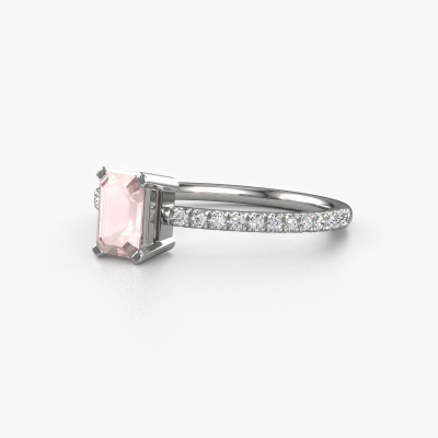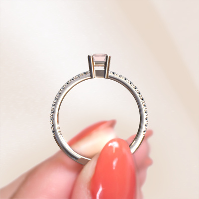 The ring shown above is called the Denita 2 EME. We call this type of ring a pavé solitaire ring because it has one centre gemstone and a band that is also pave set with gemstones. This engagement ring is made in 14 Carat white gold set with a 6x4 mm emerald cut morganite champagne, and pave set diamonds at the sides. Each piece of jewellery is made just for you by our master goldsmiths in our own studio.This traditional white gold pavé solitaire engagement ring has an exquisite emerald cut morganite champagne centre stone. To further accentuate the centre stone, the band is set full with more diamonds. Its open prong setting allows light to strike the morganite champagne from various angles and this adds sparkle to your morganite champagne ring. The photo shown above depicts the goldsmith's carefully handcrafted details of the ring. The high positioning of the centre stone is truly eye-catching. The perfect engagement ring for the crown jewel of your life!Are you on a budget? Please feel free to contact us, so we can go discuss your options. We offer our engagement rings at guaranteed best price, because we make them to order. You won't find such a price anywhere else!Our team adds new designs to our online collection daily. Our designers and goldsmiths work together in creating the best design. We strive to offer a diverse collection of jewels. Perhaps you have a specific jewel design in mind. One you came across somewhere. Please contact us for a free consultation. We will make you an offer, based on a fair price/ quality ratio, that will baffle you.To make it easier for you, we offer a 30 day return policy. Check our terms and conditions.